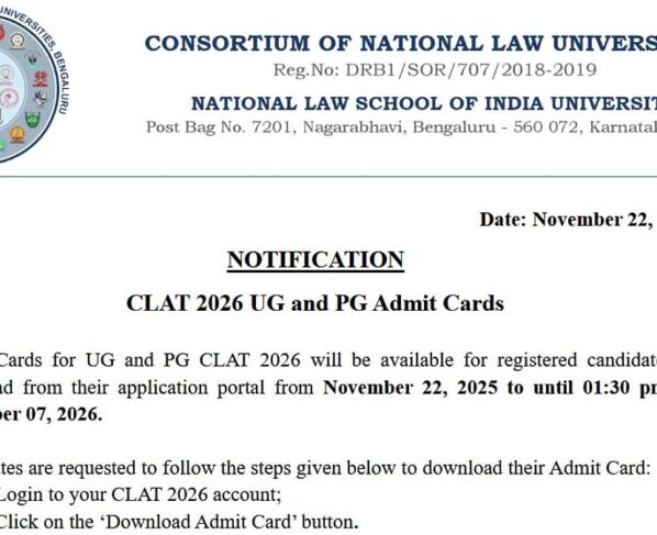 CLAT 2026 Admit Card: The Consortium of National Law Universities has released the CLAT 2026 admit card for UG and PG programs. The exam will be held on December 7,…