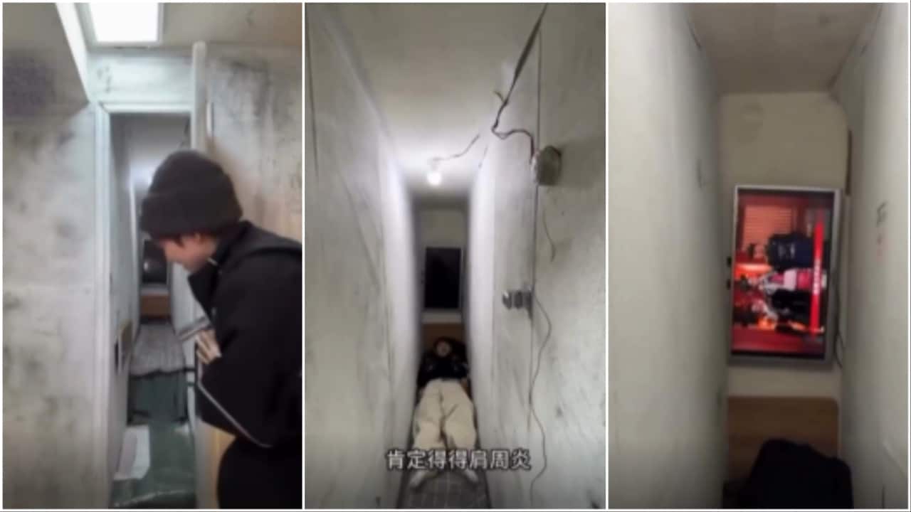 In the viral video, the narrator demonstrates that the space is so tight that a person must enter sideways. ‘The biggest flaw? If you want to hang yourself, it’s not tall enough,’ she jokes darkly.