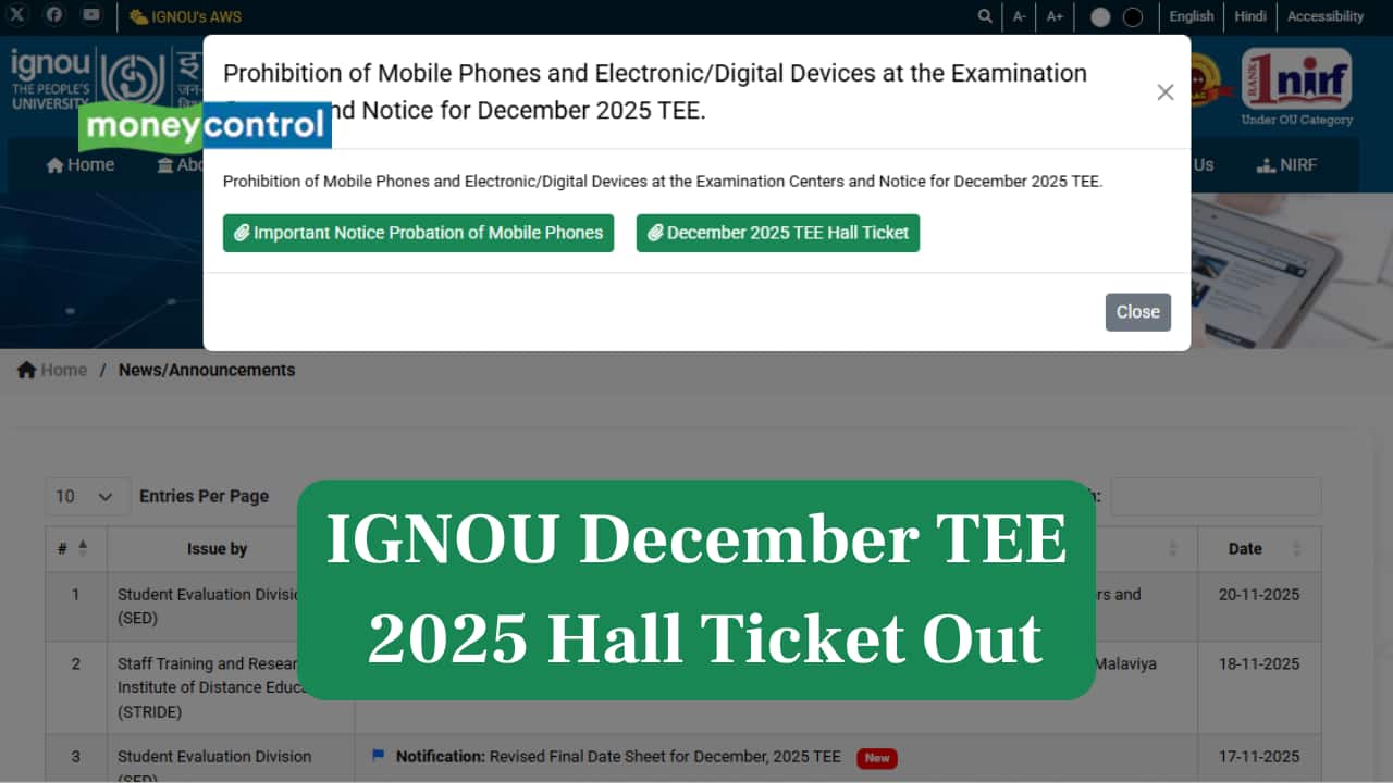 IGNOU has released the December TEE 2025 hall tickets on ignou.ac.in. Students can download them using their enrollment number. The exams will take place from 1 December 2025 to 14 January 2026.