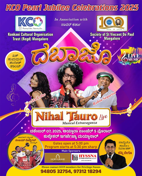 Media ReleaseMangaluru, Nov 15: After the successful Pearl Jubilee celebrations at Abu Dhabi on November 8, Konkani Cultural Organization (KCO) is hosting the last and most awaited event called ‘Dabazo’ Nihal Tauro Live on December 7 at 5.30 pm sharp at Kulshekar c….