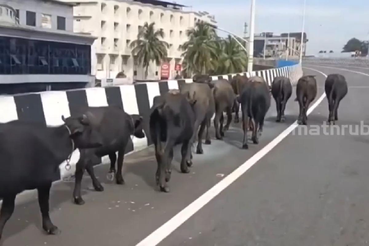 A herd of buffaloes blocked NH 66 in Kasaragod. Officials acted promptly to clear traffic safely.