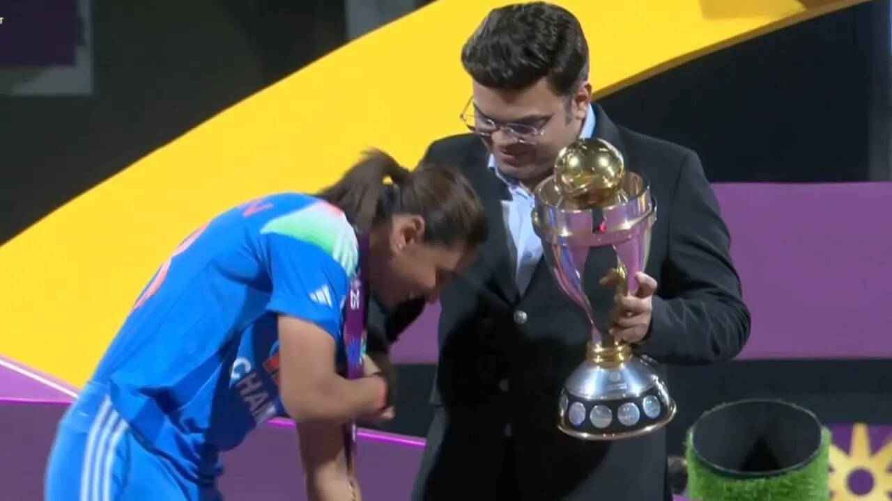 India won their first-ever Women’s World Cup in 2025. Harmanpreet Kaur celebrated the moment, lifting the trophy presented by Jay Shah. A viral moment occurred when Kaur attempted to touch Shah’s feet.